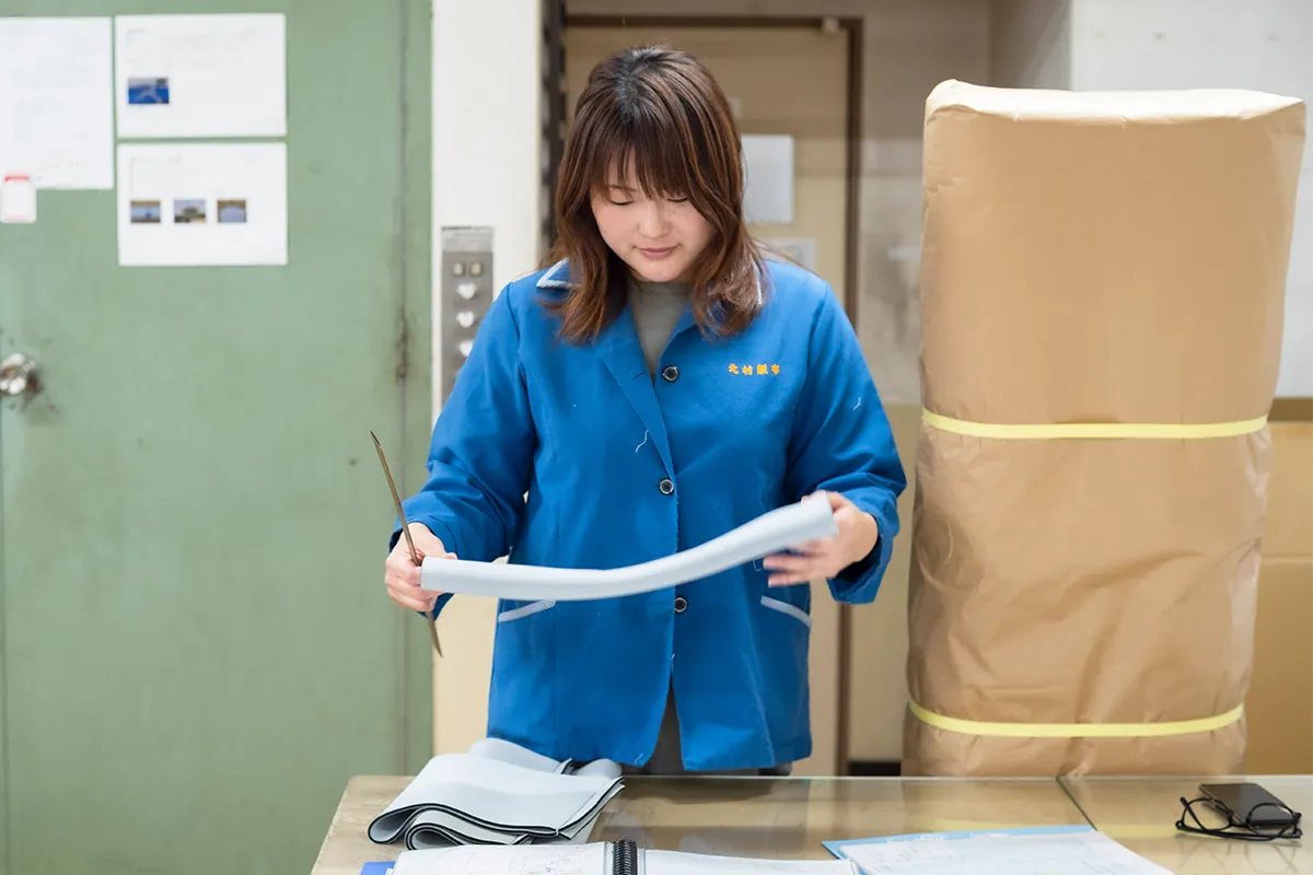 完成品と設計図の照合(サイズ・生地・仕様等)を行い、数量の確認や異物混入(糸くず・金属片・ゴミ等)の検査を行います。