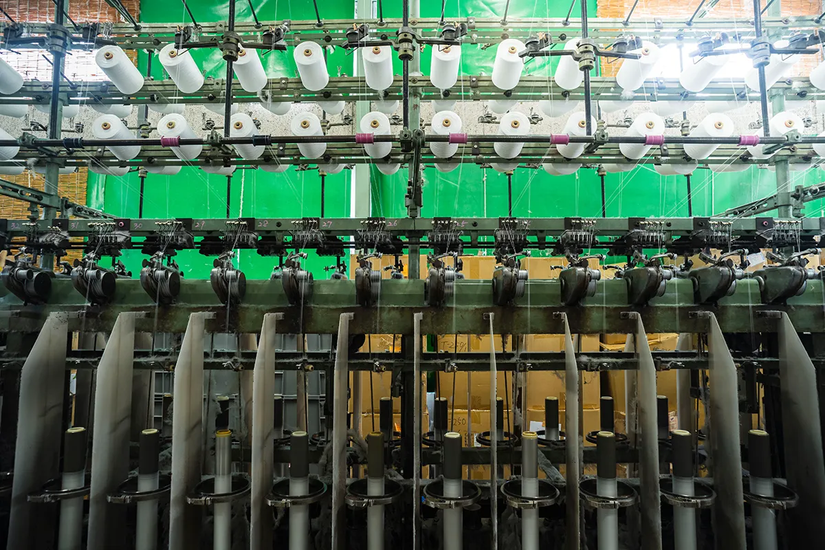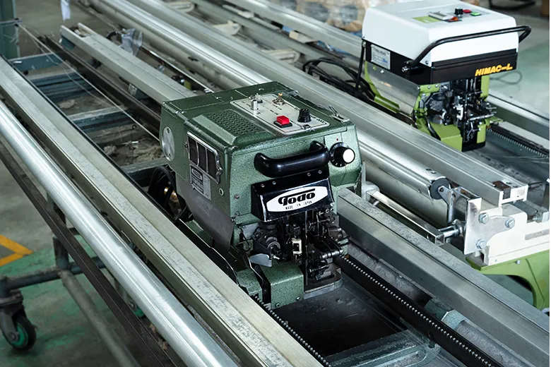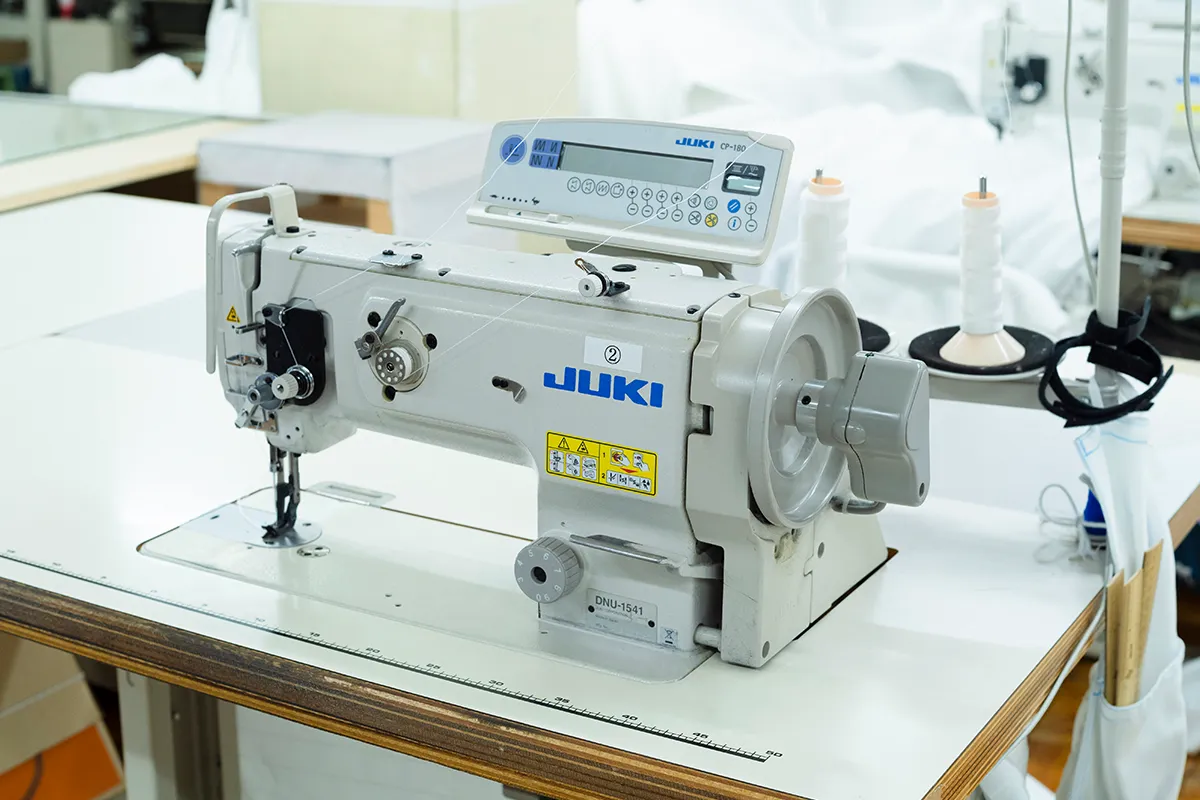 Our in-house facility handles all processes from raw yarn procurement through yarn twisting, warping, weaving, cutting, and sewing.